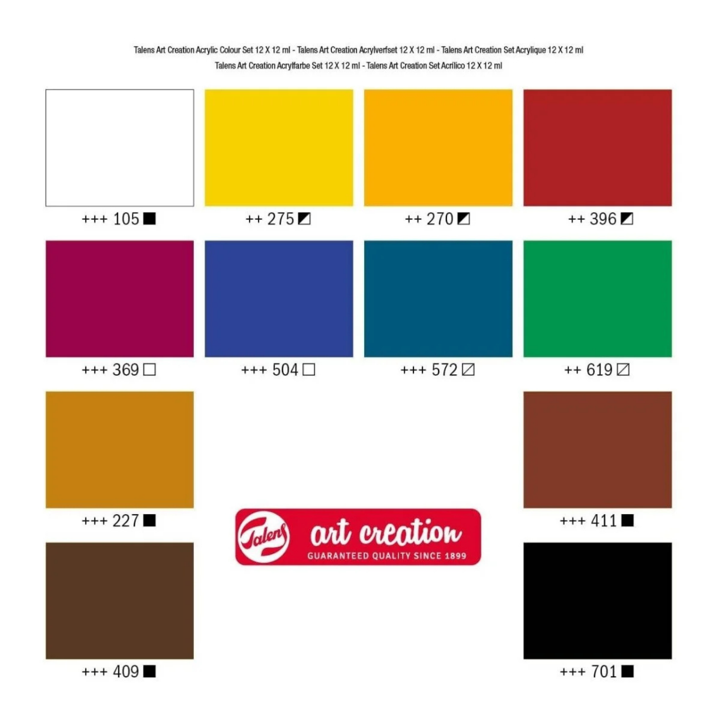 Talens Art Creation akrilik boyaları hakkında Talens Art Creation akrilik boyaları, akrilik reçine bazlı, güvenilir kalitede bir akrilik boyadır. Boya macun kıvamındadır, çabuk kurur ve kuruduğunda ipeksi bir parlaklığa sahiptir.